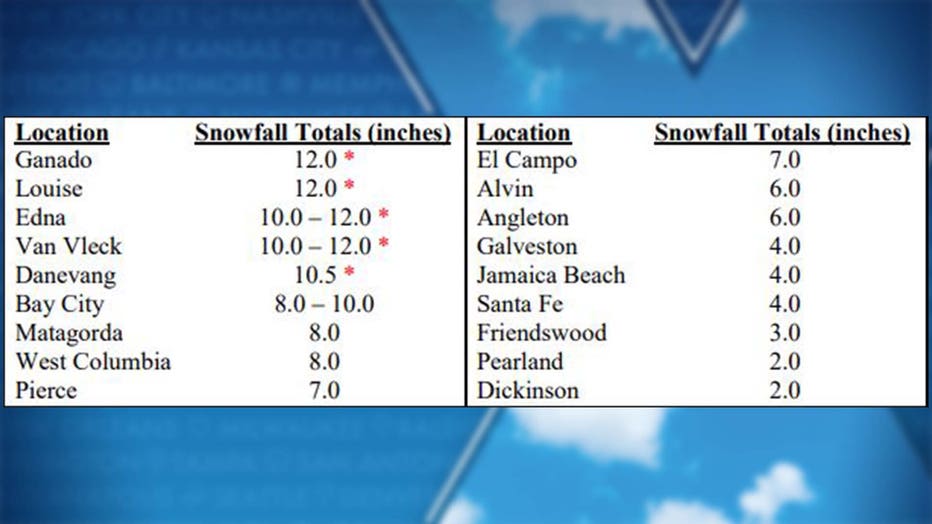 FILE - The following table lists some of the higher snowfall totals across southeast Texas. (National Weather Service)