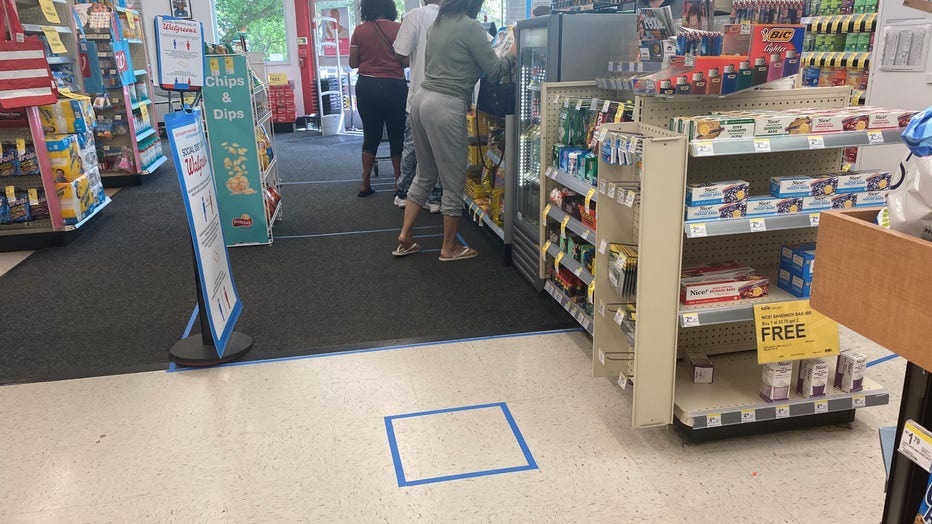 Walgreen's put blue tape on the floor of their checkout line to make sure people are following the Centers for Disease Control recommendations to stay 6 feet apart.