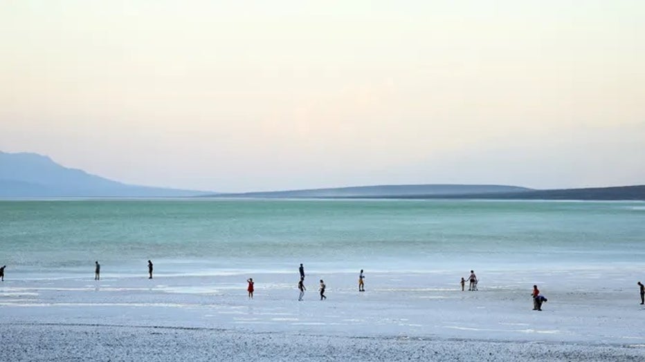 Visitors gather at the edge of the sprawling temporary lake at Badwater Basin salt flats. Oct. 22, 2023. (Mario Tama / Getty Images)
