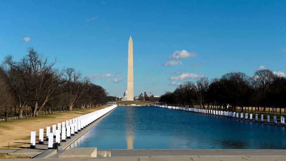 FILE-A memorial to victims of Covid-19 is seen at the Lincoln Memorial pool on January 19, 2021 in Washington, DC. (PATRICK T. FALLON/AFP via Getty Images)
