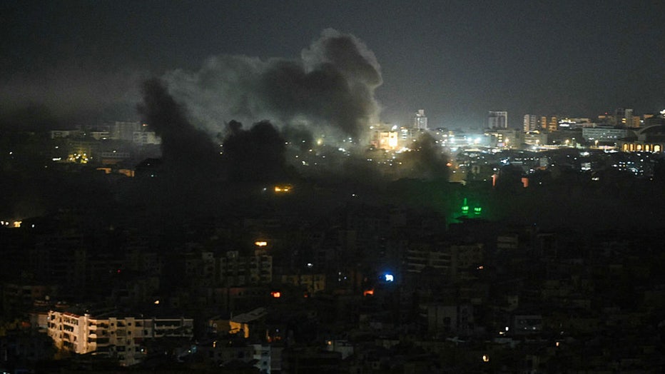 A plume of smoke rises from the site of an Israeli airstrike in the southern suburbs of Beirut early on March 12, 2026. (Photo by FADEL itani / AFP via Getty Images)
