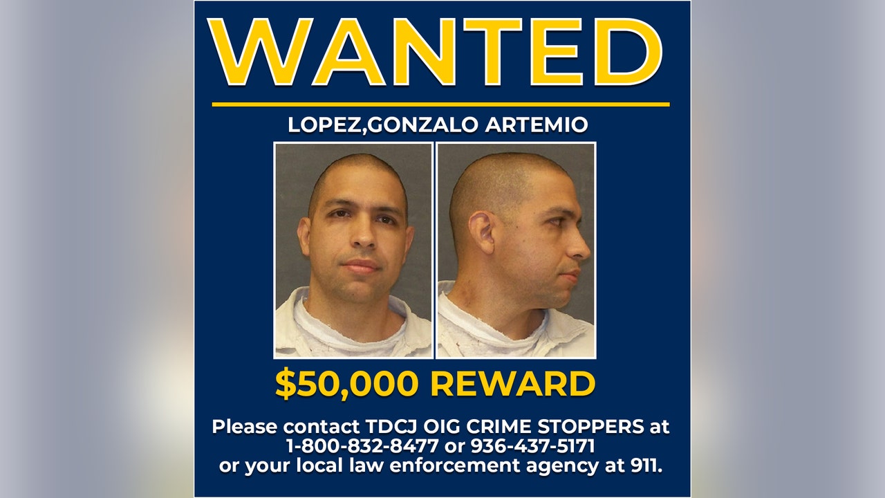 As of Friday evening, a $50,000 reward has been offered for information leading to Lopez's capture by calling TDCJ OIG CRIME STOPPERS at 1-800-832-8477 or 936-437-5171 or your local law enforcement agency at 911. You can also leave a tip online, by clicking here.