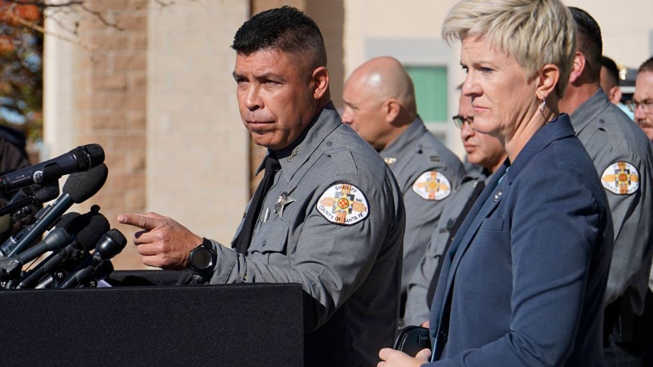 Santa Fe County Sheriff Adan Mendoza, with District Attorney Mary Carmack-Altwies (R), speaks to the press on Oct. 27, 2021, about the criminal investigation regarding the fatal shooting and wounding of crew members on the set of the movie "Rust," in