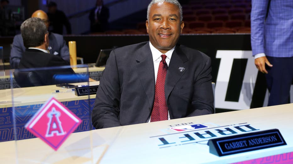 Los Angeles Angels club representative Garret Anderson looks on during the 2021 Major League Baseball Draft at Bellco Theater at Colorado Convention Center on Sunday, July 11, 2021 in Denver, Colorado. (Photo by Mary DeCicco/MLB Photos via Getty Imag