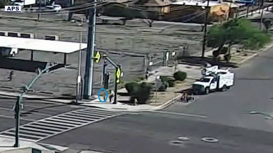 Surveillance video shows the moments just after 3:10 p.m. on March 19 when APS troubleshooter Robert Butler is driving down Grant Street and 2nd Avenue. He notices a wagon and umbrella on the sidewalk. Thinking it's odd, he then realizes that a toddler, estimated to be around 3 years old, is booking it up the sidewalk, unaware that a very busy street is ahead of him.