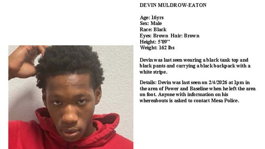 Devin Muldrow-Eaton, 16, was last seen on foot near Power and Baseline Roads. He was wearing a black tank top and black pants. He was also carrying a black backpack with a white stripe.