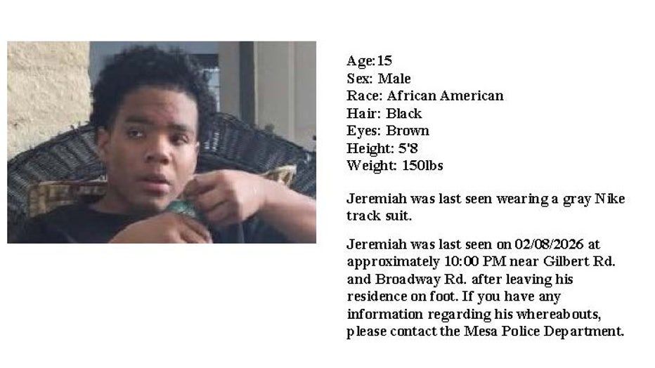 Jeremiah Bennett, 15, was last seen leaving his home on foot near Gilbert and Broadway Roads in Mesa. He was wearing a gray Nike tracksuit.