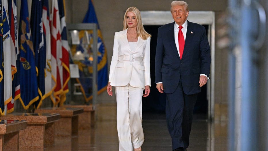 U.S. President Donald Trump and U.S. Attorney General Pam Bondi (L) arrive to speak at the Department of Justice in Washington, DC, on March 14, 2025.