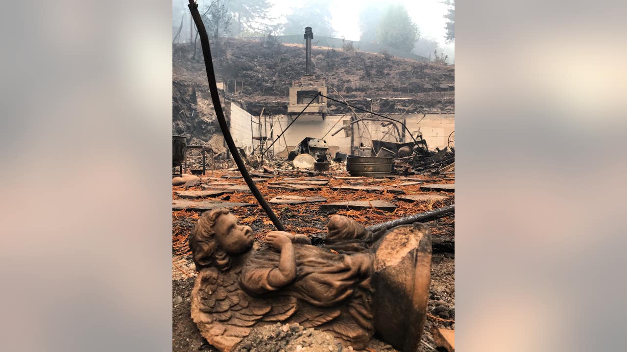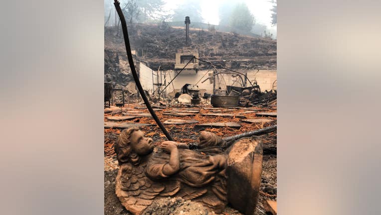 A garden sculpture is burned in Boulder Creek. Aug. 24, 2020