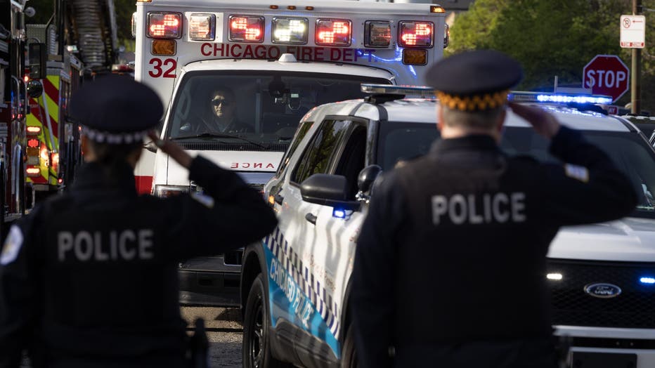 CHICAGO, ILLINOIS - APRIL 25: Police officers salute as the body of a fellow officer arrives at the county morgue after being fatally shot in the line of duty on April 25, 2026 in Chicago, Illinois. The officer was one of two officers shot this morni