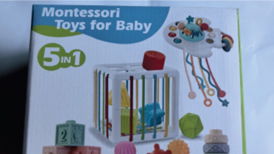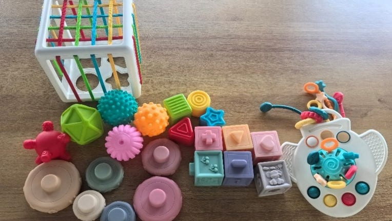 The toy set is the SpringFlower 5-in-1 Montessori Toy Set. It comes with six stacking blocks, six stacking rings, five sensory balls, a shape sorting bin and an airplane-shaped teething toy attached to it. In the recall notice, the Consumer Product Safety Commission (CPSC) says the teething toy has tentacle ends that can choke small children.