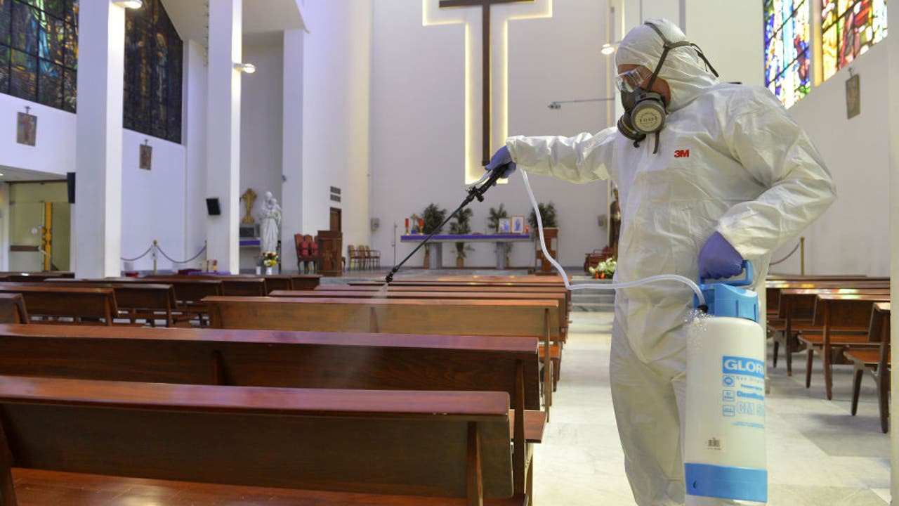 A health official wearing a protective suit sprays disinfectant at a church as a precaution against the novel coronavirus in Beirut, Lebanon on March 5, 2020. (Photo by Hussam Chbaro/Anadolu Agency via Getty Images)