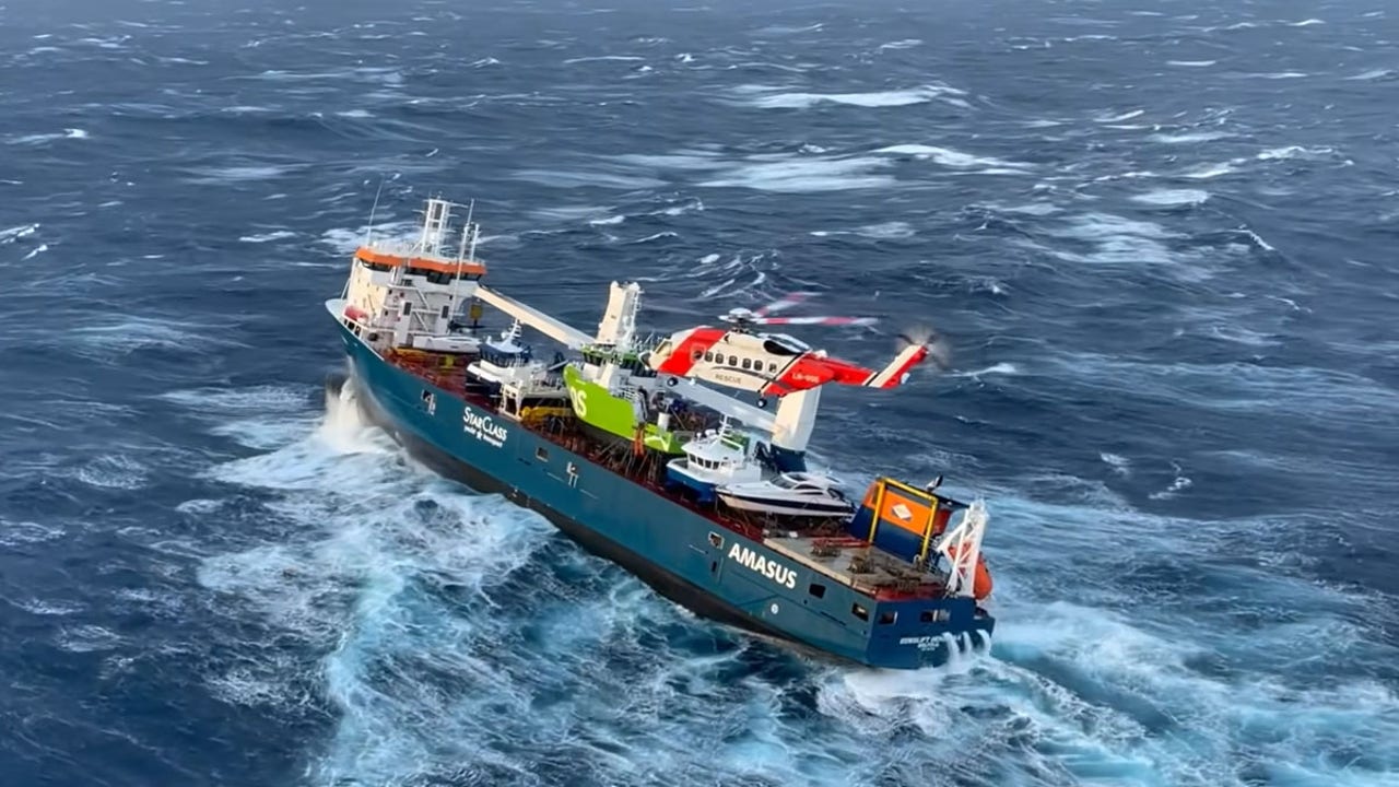 One person was transported to hospital after the crew of a Dutch cargo ship were airlifted from their vessel after issuing a distress signal off the coast of Alesund, Norway, on April 5, the local rescue service said. (Credit: Hovedredningssentralen Sør-Norge via Storyful)