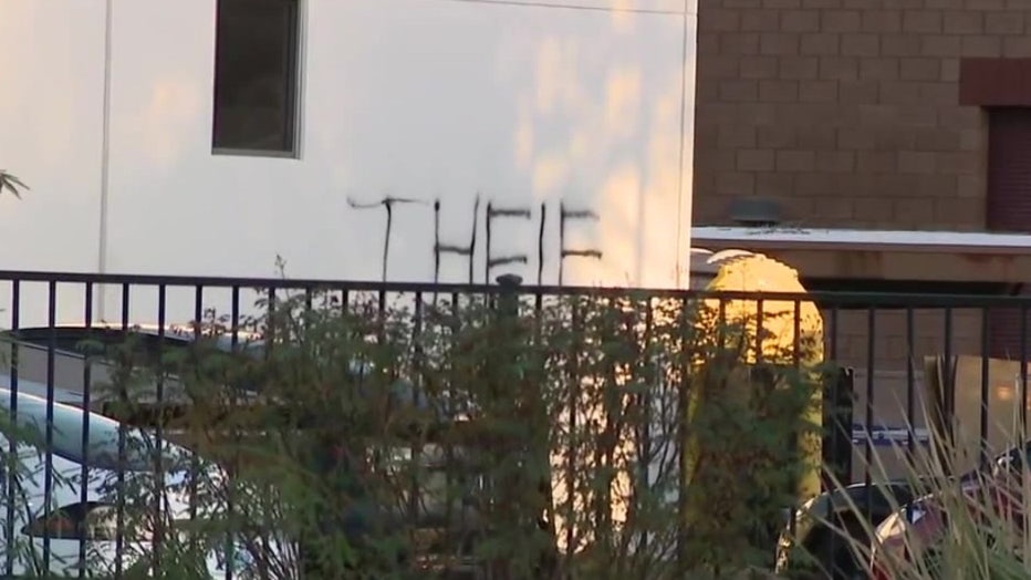 Video from the scene showed the misspelled word "thief" painted on the side of a building.