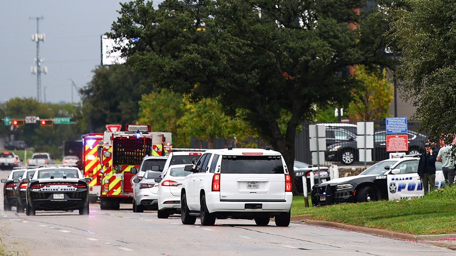 Law enforcement and emergency personnel respond near the scene of a shooting at a US Immigration and Customs Enforcement (ICE) detention facility in Dallas, Texas, on September 24, 2025. (Credit: ARIC BECKER/AFP via Getty Images)