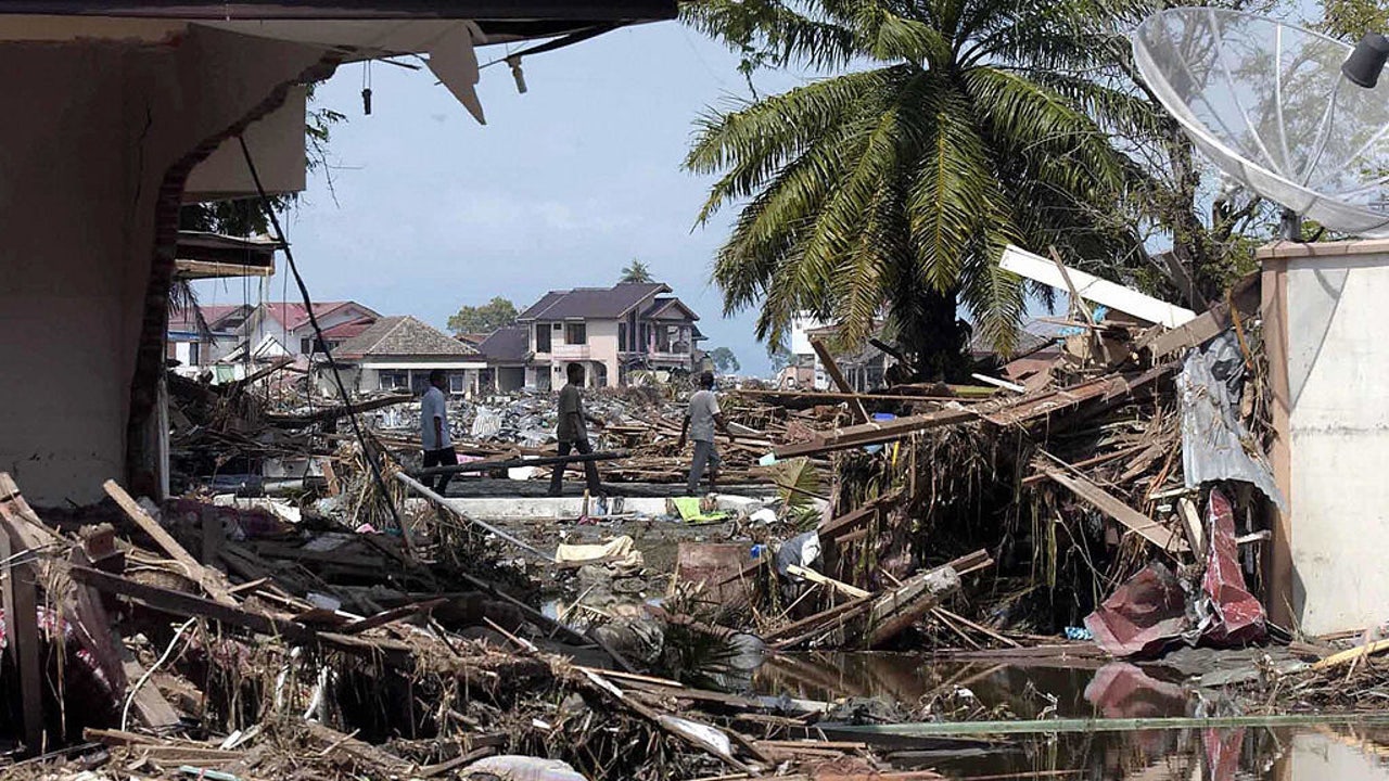 FILE-Residents of Banda Aceh walk through a scene of destruction on December 27, 2004, following a devastating quake and series of tidal waves that struck the province in Indonesia. (BAY ISMOYO/AFP via Getty Images)
