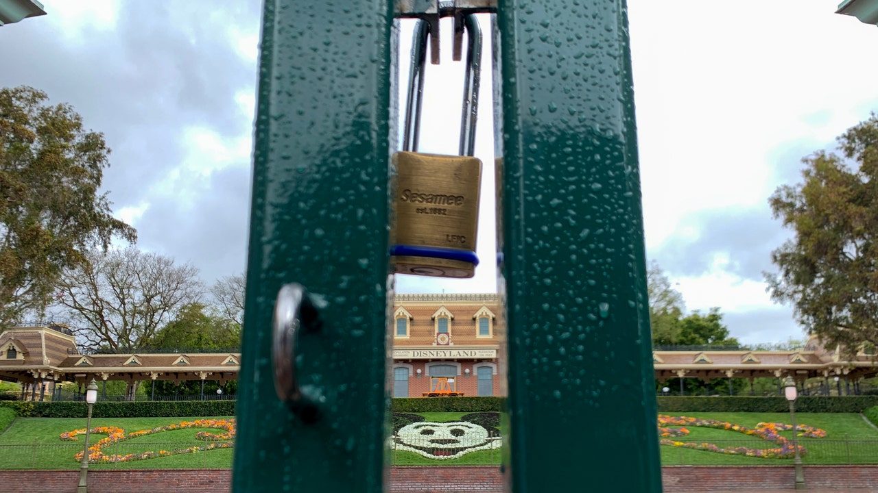 ANAHEIM, CA - MARCH 16: A lock hangs on the center gate between the turnstiles at the entrance to Disneyland in Anaheim, CA, on Monday, Mar 16, 2020. The entire Disneyland Resort is shutting down due to the coronavirus (COVID-19) outbreak. (Photo by