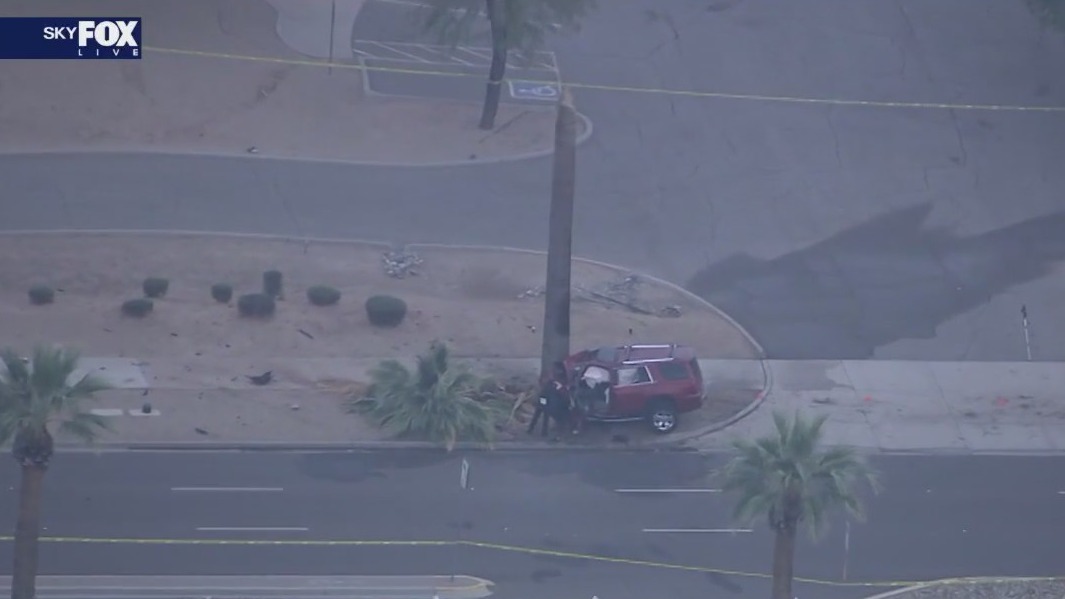 SkyFOX video over the scene showed a red SUV that crashed into a palm tree near Litchfield Road and Palm Valley Boulevard. The driver was hospitalized. Their condition is unknown.