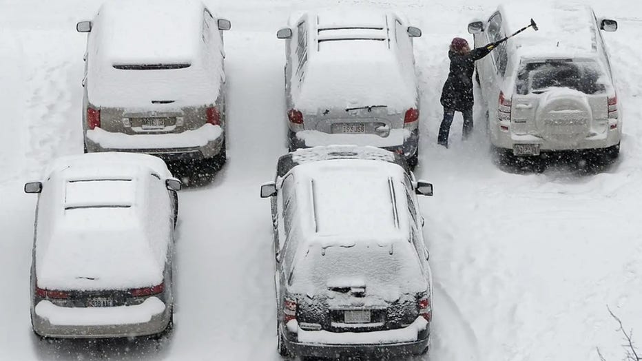 Woman clears snow off a car in a downtown parking lot in Portland, Maine. (Gregory Rec/Portland Press Herald / Getty Images)