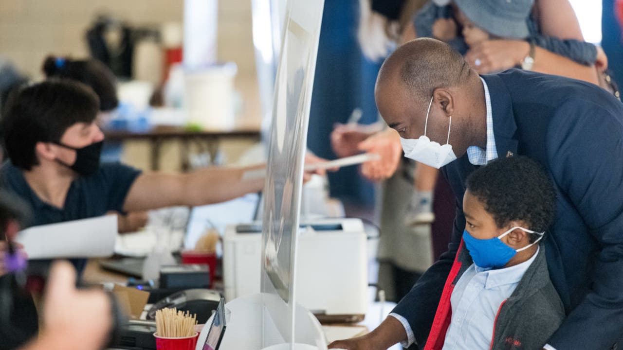 Democratic U.S. senate candidate Jaime Harrison checks in at a polling location with his son, William, during early voting on October 19, 2020 in Columbia, South Carolina. Harrison is challenging Republican Sen. Lindsey Graham.