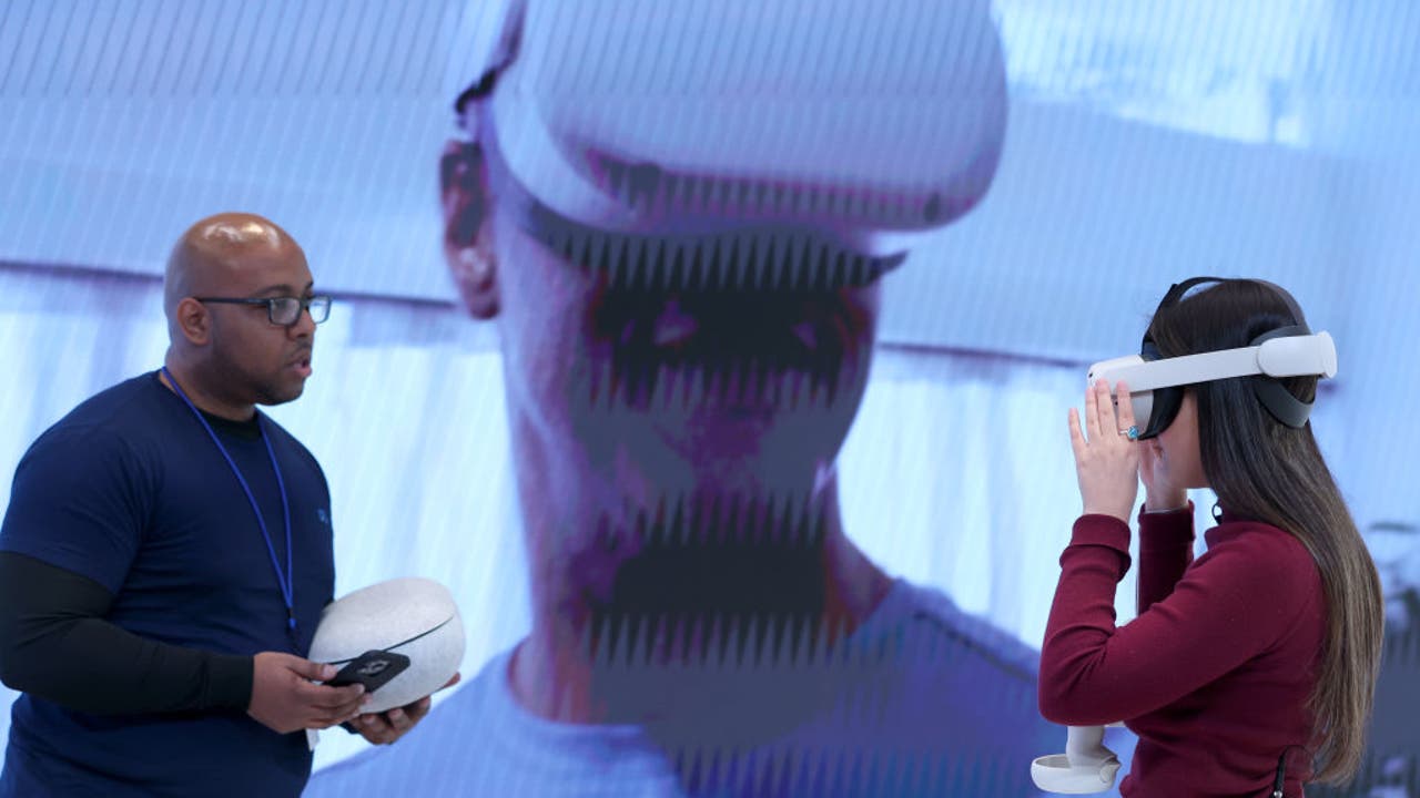 BURLINGAME, CALIFORNIA - MAY 04: Meta employee Ryan Carter (L) helps a member of the media with an Oculus virtual reality headset demonstration during a media preview of the new Meta Store on May 04, 2022 in Burlingame, California. Meta is set to ope