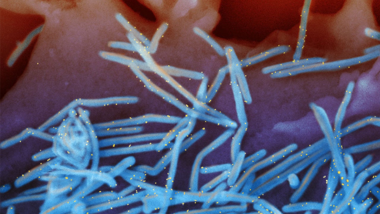 FILE - Scanning electron micrograph of human respiratory syncytial virus (RSV) virions (colorized blue) and labeled with anti-RSV F protein/gold antibodies (colorized yellow) shedding from the surface of human lung epithelial A549 cells. ( IMAGE POINT FR/NIH/NIAID/BSIP/Universal Images Group via Getty Images)