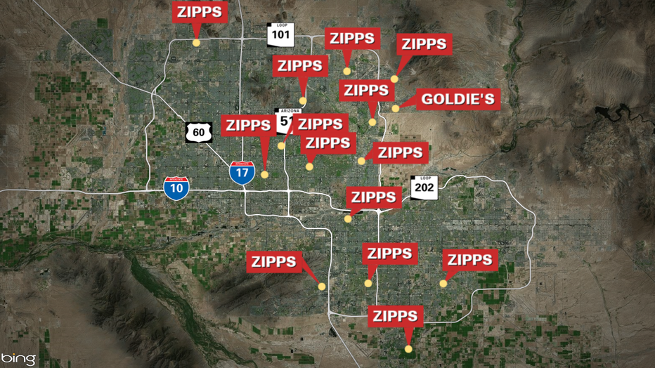 There are a total of 15 Zipps locations in the Valley: 5 in Phoenix, 5 in Scottsdale, 1 in Glendale, 2 in Tempe, 1 in Chandler and 1 in Gilbert.