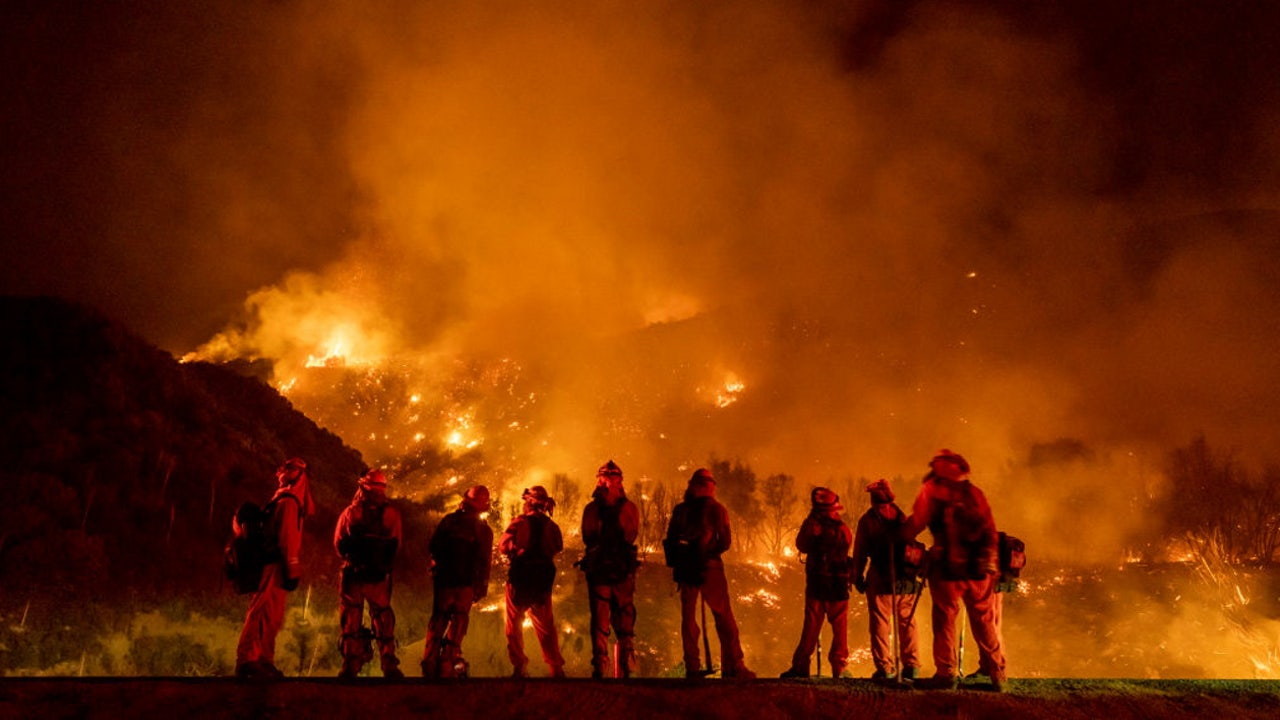 A group of inmate firefighters watch as the El Dorado Fire burns a hillside near homes in Mountain Home Village, California, inside the San Bernardino National Forest, September 9, 2020. (Photo by Kyle Grillot for The Washington Post via Getty Images