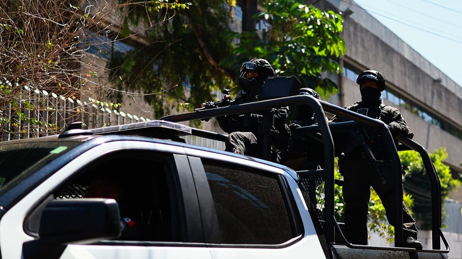 MEXICO CITY, MEXICO - FEBRUARY 23: Police officers stands guard outside the Fiscalia Especializada en Materia de Delincuencia Organizada on February 23, 2026 in Mexico City, Mexico. The Secretariat of National Defense of Mexico confirmed that during