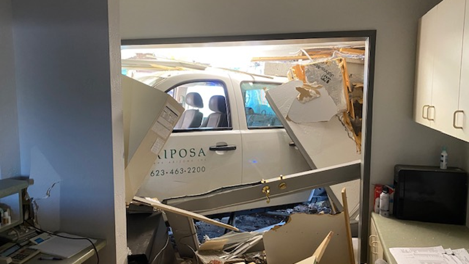 PHOENIX - An accident involving four vehicles sent a landscaping truck into a dentist's office near 12th Street and Glendale Friday morning, according to Phoenix Fire officials.