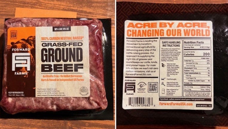 The Forward Farms Grass-Fed Ground Beef items were packed in 16-ounce packages produced on Dec. 16. The products are labeled as 16-oz. (1-lb.) vacuum-sealed packages with "USE OF FREEZE BY 01/13/26 EST 2083" printed on the side of the packaging.
