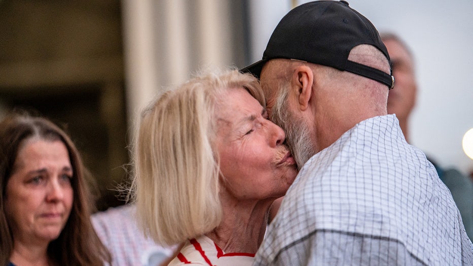 Dennis Coyle (R) embraces his mother as he arrives at Kelly Field at Joint Base San Antonio in San Antonio, Texas, on March 25, 2026. (Photo by SERGIO FLORES / AFP via Getty Images)