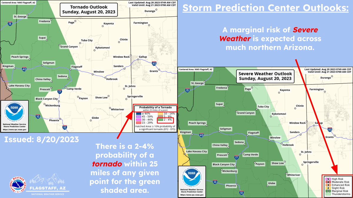 The Storm Prediction Center has issued a marginal risk of Severe Weather across much of N. AZ, including a 2-4% probability of a tornado within 25 miles of any given point for areas shaded in green on the left-hand side map. - @NWSFlagstaff