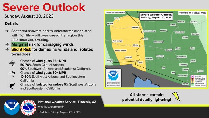 Severe thunderstorms associated with Tropical Storm Hilary will be possible across our region today. There is a slight risk for damaging winds and isolated tornadoes across southeast CA and southwest AZ. Elsewhere, damaging wind gusts will be the main threat. - @NWSPhoenix