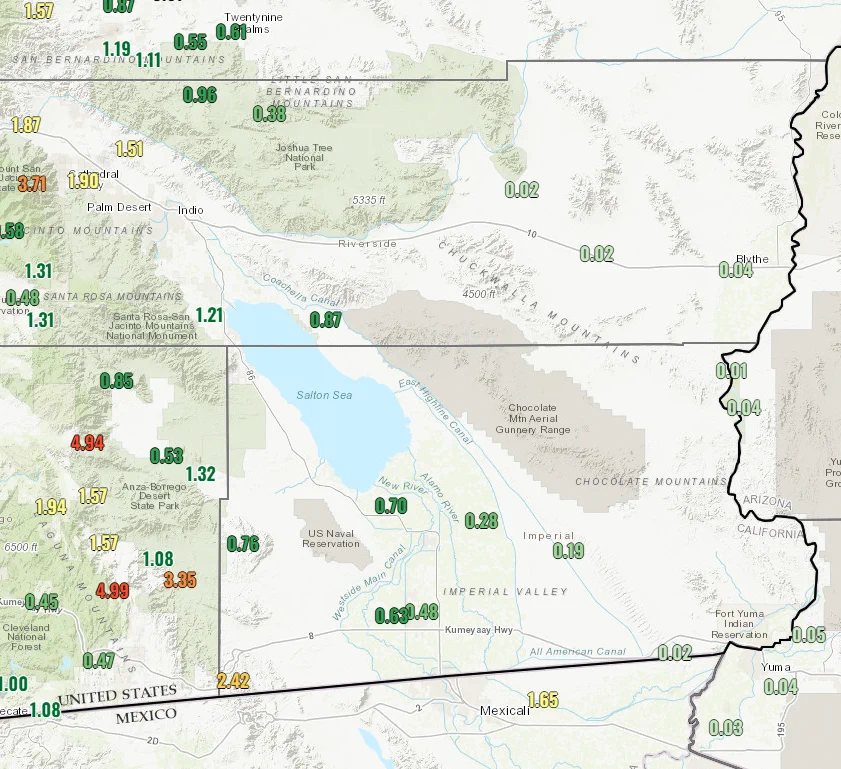 Rainfall today has been focused over California with ongoing flooding in desert and mountain locations. The map shows rain totals from the past 12 hours. Remember, runoff can travel far from the location where the rain fell. - @NWSPhoenix