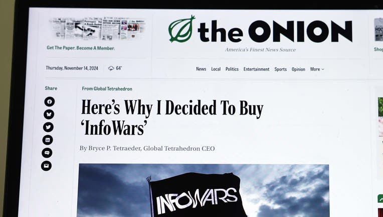 FILE - In this photo illustration, The Onion website is displayed on a computer screen, showing a satirical story titled Here’s Why I Decided To Buy ‘InfoWars’, on November 14, 2024 in Pasadena, California. (Photo Illustration by Mario Tama/Getty Ima