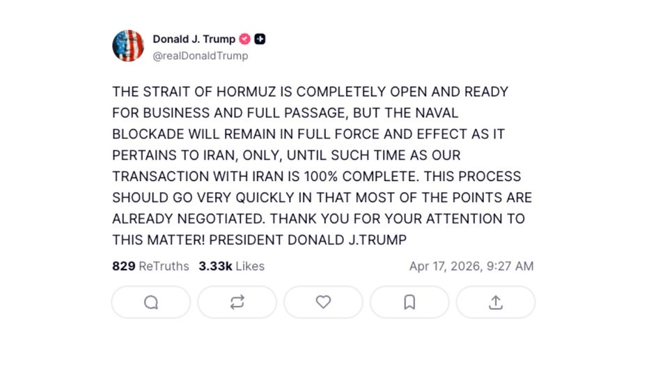 9:33 a.m. ET: President Trump says the blockade no Iranian vessels at the Strait of Hormuz will remain in full effect.