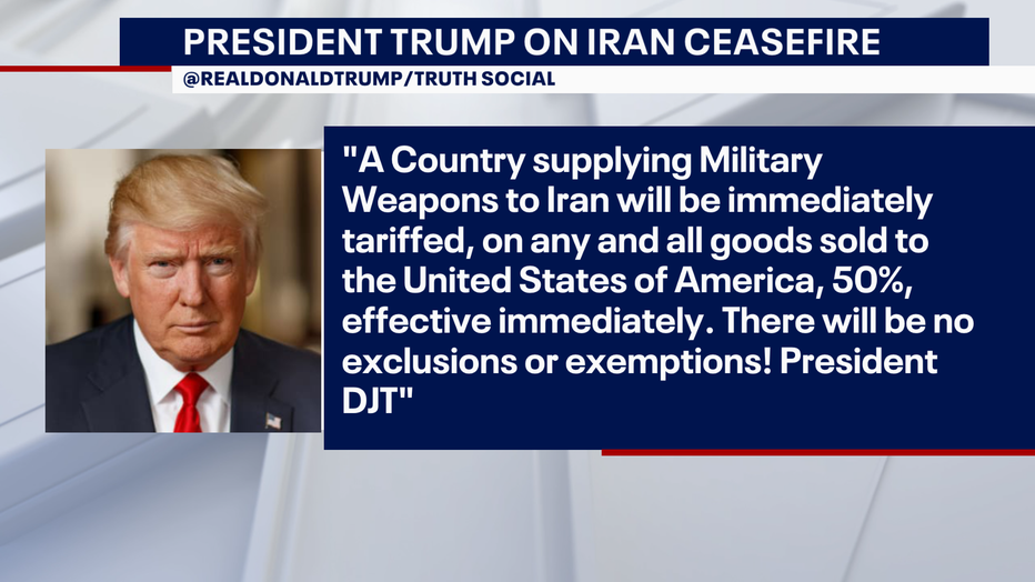 9:35 a.m. ET: President Trump says any nation that gives weapons to Iran will immediately face a 50% tariff on any goods sold to the United States.