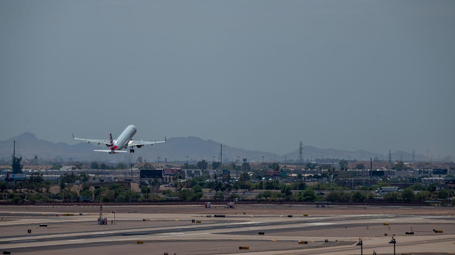 A plane takes off from Phoenix Sky Harbor International Airport (PHX) during a heatwave in Phoenix, Arizona. (Photo by Ash Ponders/Bloomberg via Getty Images)