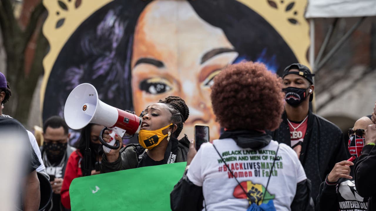 LOUISVILLE, KY - MARCH 13: A woman shouts through a megaphone during a protest memorial for Breonna Taylor in Jefferson Square Park on March 13, 2021 in Louisville, Kentucky. (Photo by Jon Cherry/Getty Images)