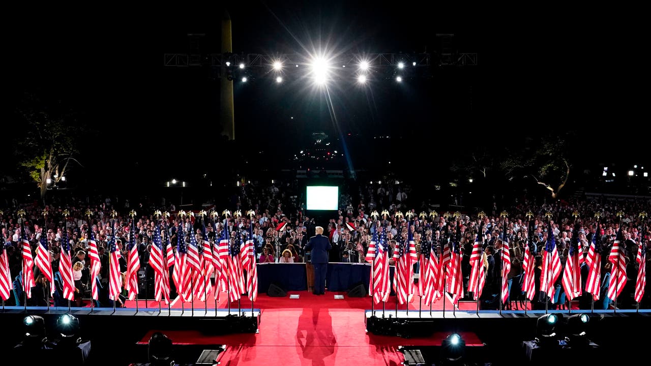 The GOP and Trump’s campaign transformed the White House grounds of the South Lawn into an outdoor convention hall, complete with a grand stage, massive Trump signs, rows of white chairs and a blur of American flags, notwithstanding the federal law that prohibits the use of taxpayer resources for partisan politics.
