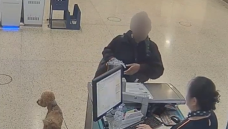 Airport employees and Las Vegas Metropolitan Police officers cared for the approximately 2-year-old golden doodle/mini poodle while she was being processed.