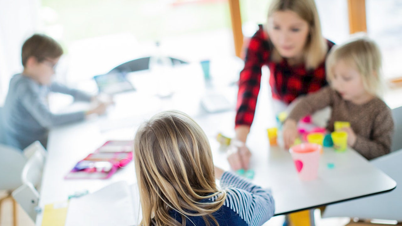 FILE - A mother sits in her living room helping her children with their schoolwork.