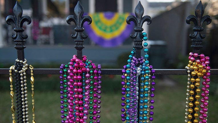 FILE-Mardi Gras beads adorn a fleur de lis iron fence along a parade route on February 7, 2016. (Photo by Erika Goldring/Getty Images)