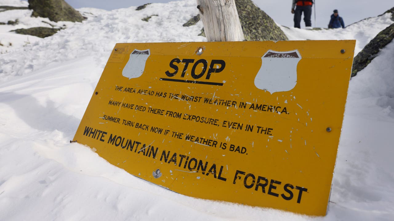 Mount Washington, NH - A sign that has blown down tells hikers that Mount Washington is home to "the worst weather in America" advising them to turn back if the weather is bad. (Photo by Jessica Rinaldi/The Boston Globe via Getty Images)