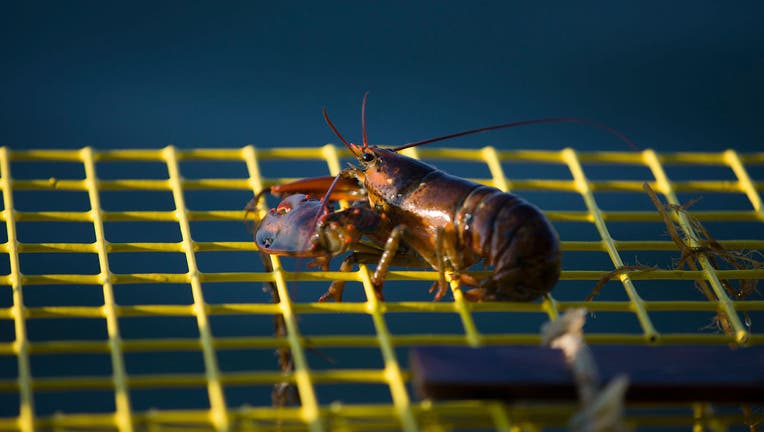 A small lobster is seen resting atop a trap before it is tossed back into the Gulf of Maine. (Photo by Joe Raedle/Getty Images)