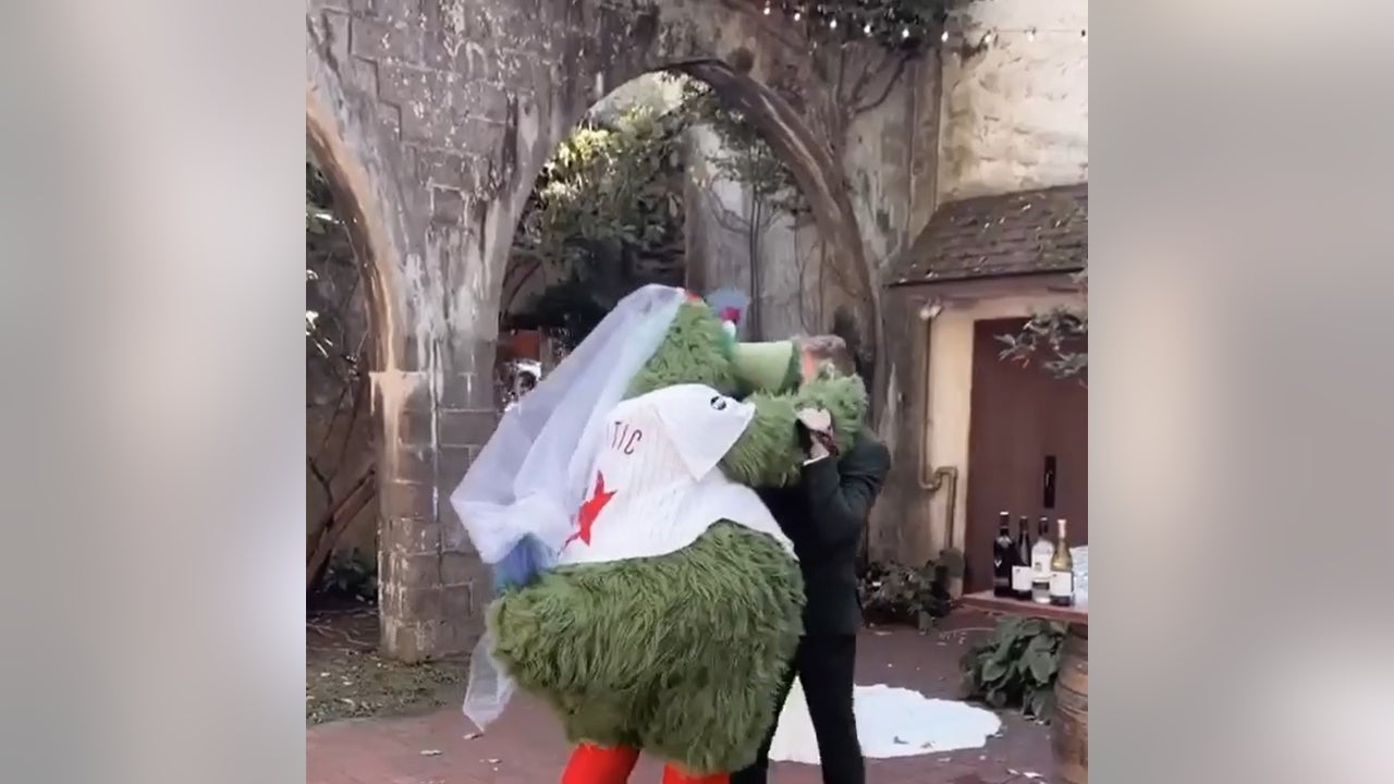 Little did the man realize, but standing before him was not his partner, but instead, the larger-than-life Phillie Phanatic mascot, who appropriately accessorized for the occasion with a veil.