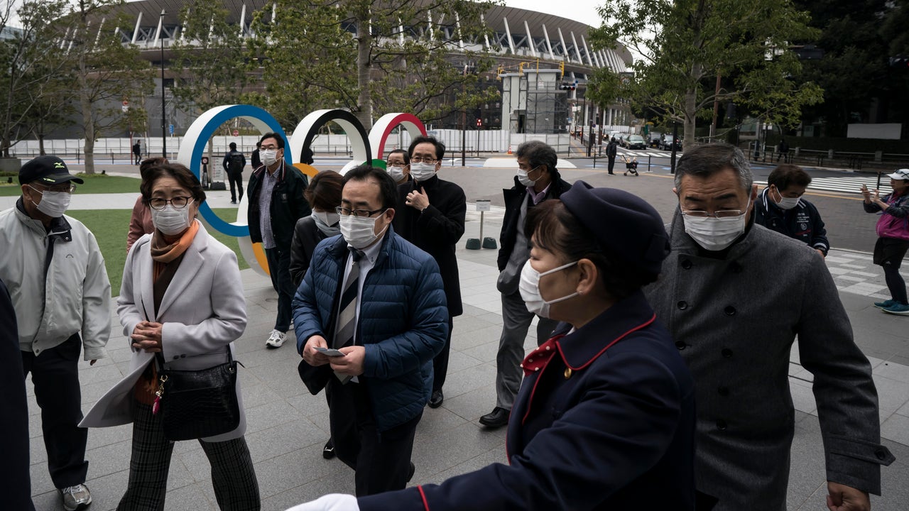 TOKYO, JAPAN - FEBRUARY 26: People wearing face masks walk past the Olympic rings in front of the new National Stadium, the main stadium for the upcoming Tokyo 2020 Olympic and Paralympic Games, on February 26, 2020 in Tokyo, Japan. Concerns that the