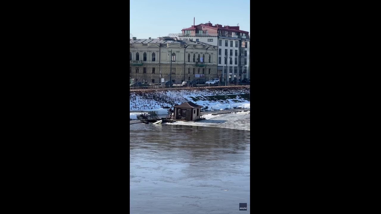 Drone footage captured a rare and striking moment in Vilnius, Lithuania, showing a small summer house drifting down a river after becoming detached as ice began to melt.