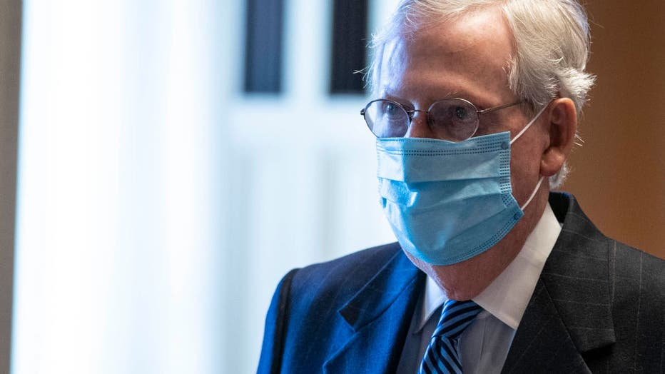 FILE - Senate Majority Leader Mitch McConnell (R-KY) walks from the Senate floor to his office in the U.S. Capitol ahead of the weekly Senate Republican caucus luncheon on November 10, 2020 in Washington, DC. (Sarah Silbiger/Getty Images)